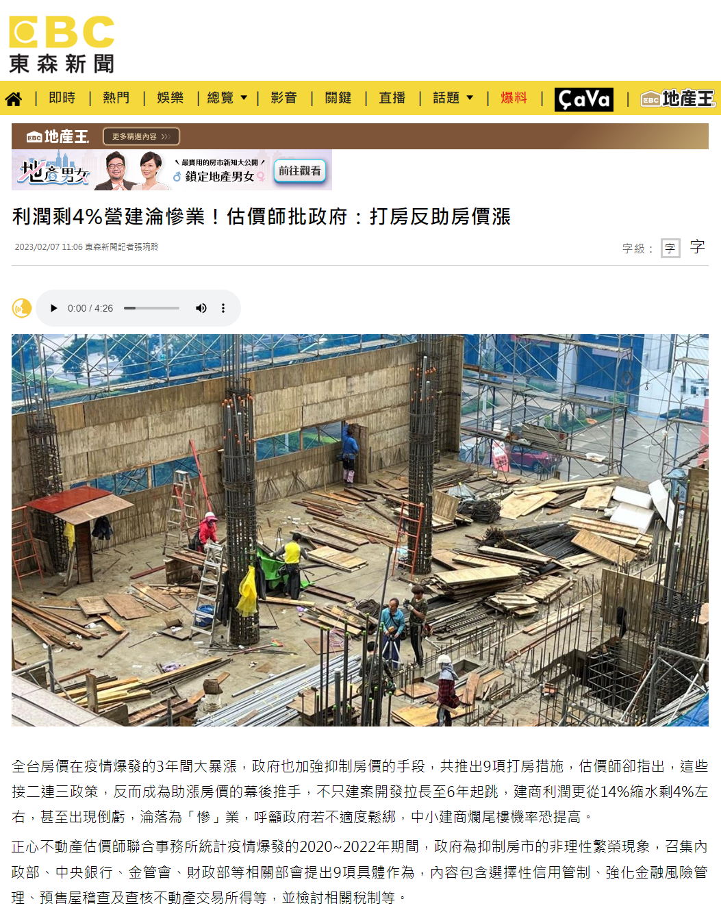 全台房價在疫情爆發的3年間大暴漲,政府也加強抑制房價的手段,共推出9項打房措施,估價師卻指出,這些接二連三政策,反而成為助漲房價的幕後推手,不只建案開發拉長至6年起跳,建商利潤更從14%縮水剩4%左右,甚至出現倒虧,淪落為「慘」業,呼籲政府若不適度鬆綁,中小建商爛尾樓機率恐提高。