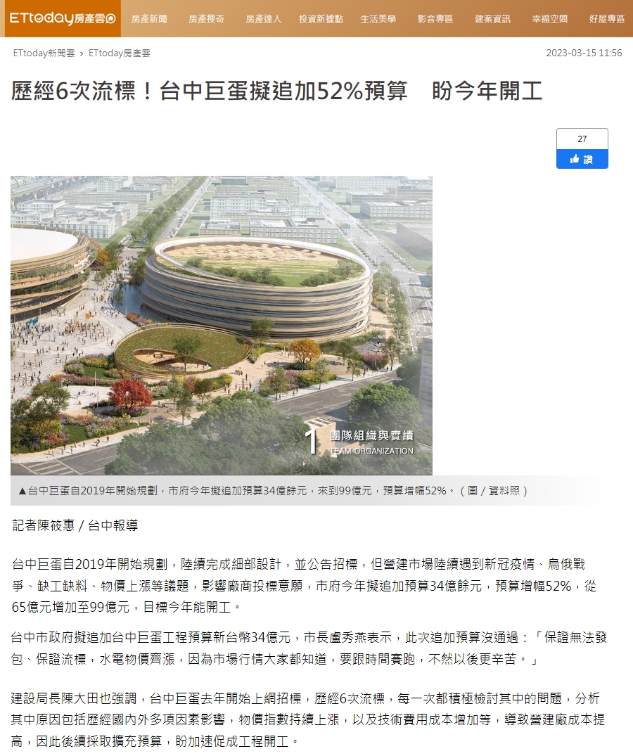 建設局長陳大田也強調,台中巨蛋去年開始上網招標,歷經6次流標,每一次都積極檢討其中的問題,分析其中原因包括歷經國內外多項因素影響,物價指數持續上漲,以及技術費用成本增加等,導致營建廠成本提高,因此後續採取擴充預算,盼加速促成工程開工。