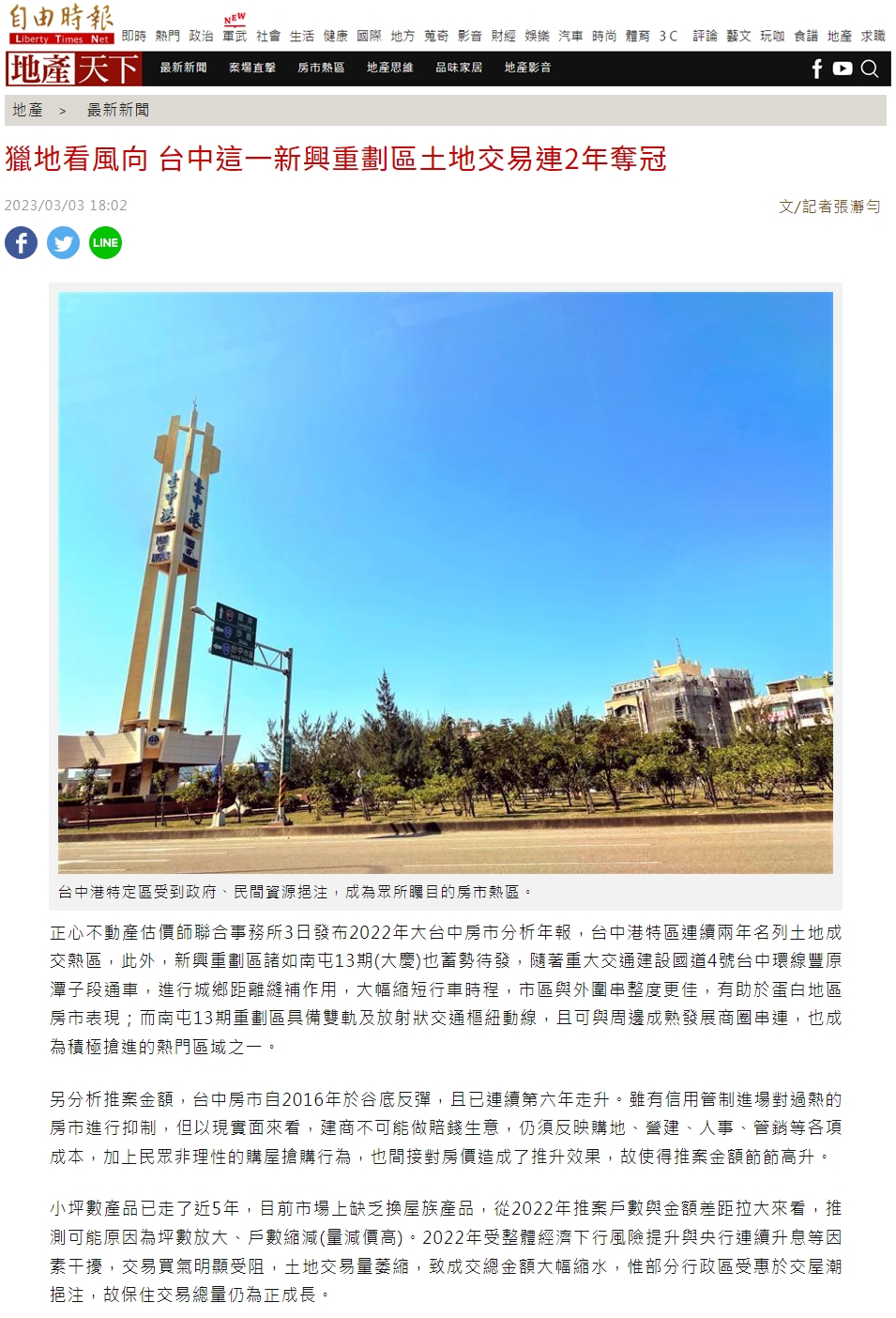 正心不動產估價師聯合事務所3日發布2022年大台中房市分析年報,台中港特區連續兩年名列土地成交熱區,此外,新興重劃區諸如南屯13期(大慶)也蓄勢待發,隨著重大交通建設國道4號台中環線豐原潭子段通車,進行城鄉距離縫補作用,大幅縮短行車時程,市區與外圍串整度更佳,有助於蛋白地區房市表現;而南屯13期重劃區具備雙軌及放射狀交通樞紐動線,且可與周邊成熟發展商圈串連,也成為積極搶進的熱門區域之一。