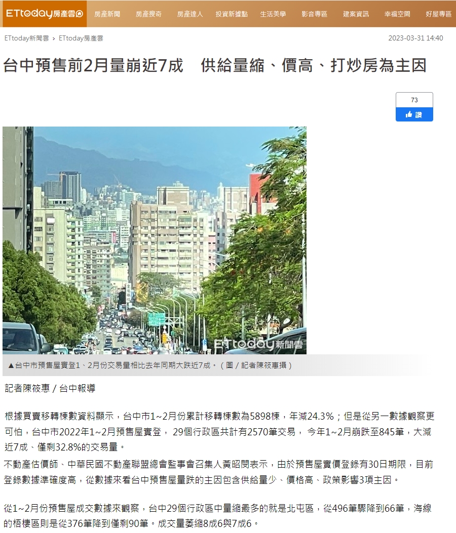 根據買賣移轉棟數資料顯示,台中市1~2月份累計移轉棟數為5898棟,年減24.3%;但是從另一數據觀察更可怕,台中市2022年1~2月預售屋實登, 29個行政區共計有2570筆交易, 今年1~2月崩跌至845筆,大減近7成、僅剩32.8%的交易量。