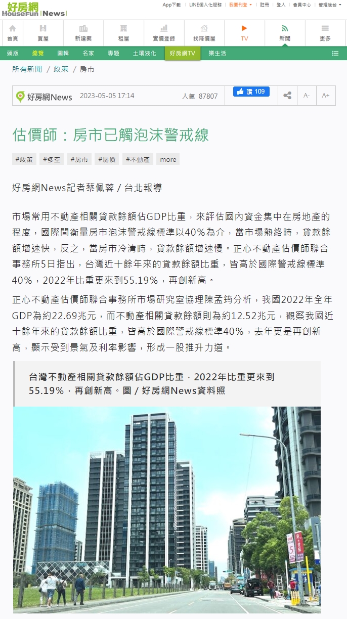 正心不動產估價師聯合事務所市場研究室協理陳孟筠分析,我國2022年全年GDP為約22.69兆元,而不動產相關貸款餘額則為約12.52兆元,觀察我國近十餘年來的貸款餘額比重,皆高於國際警戒線標準40%,去年更是再創新高,顯示受到景氣及利率影響,形成一股推升力道。