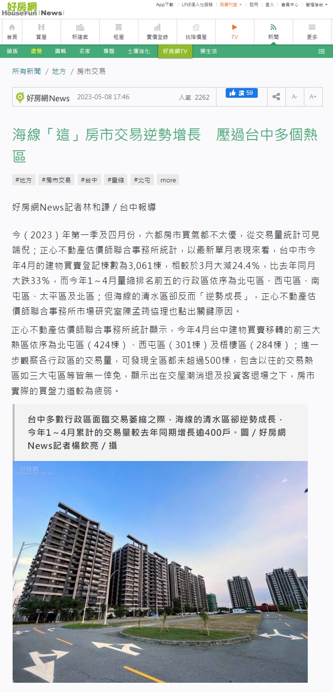 陳孟筠指出,不過值得一提的是,在多數行政區面臨交易萎縮之際,海線的清水區卻逆勢成長,今年1~4月累計的交易量較去年同期增長逾400戶,主要是受惠於單一個案交屋挹注及產業議題使買盤外溢的緣故。