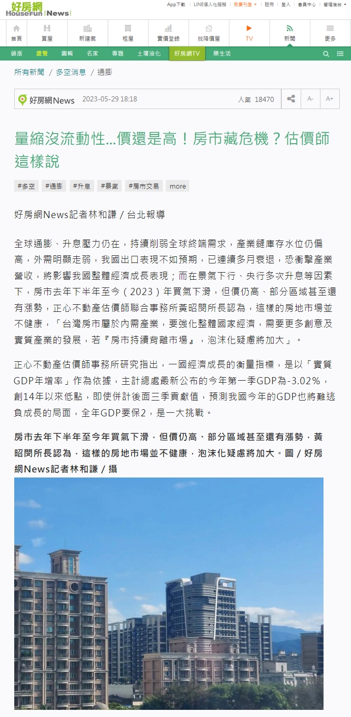 全球通膨、升息壓力仍在,持續削弱全球終端需求,產業鏈庫存水位仍偏高,外需明顯走弱,我國出口表現不如預期,已連續多月衰退,恐衝擊產業營收,將影響我國整體經濟成長表現;而在景氣下行、央行多次升息等因素下,房市去年下半年至今(2023)年買氣下滑,但價仍高、部分區域甚至還有漲勢,正心不動產估價師聯合事務所黃昭閔所長認為,這樣的房地市場並不健康,「台灣房市屬於內需產業,要強化整體國家經濟,需要更多創意及實質產業的發展,若『房市持續背離市場』,泡沫化疑慮將加大」。