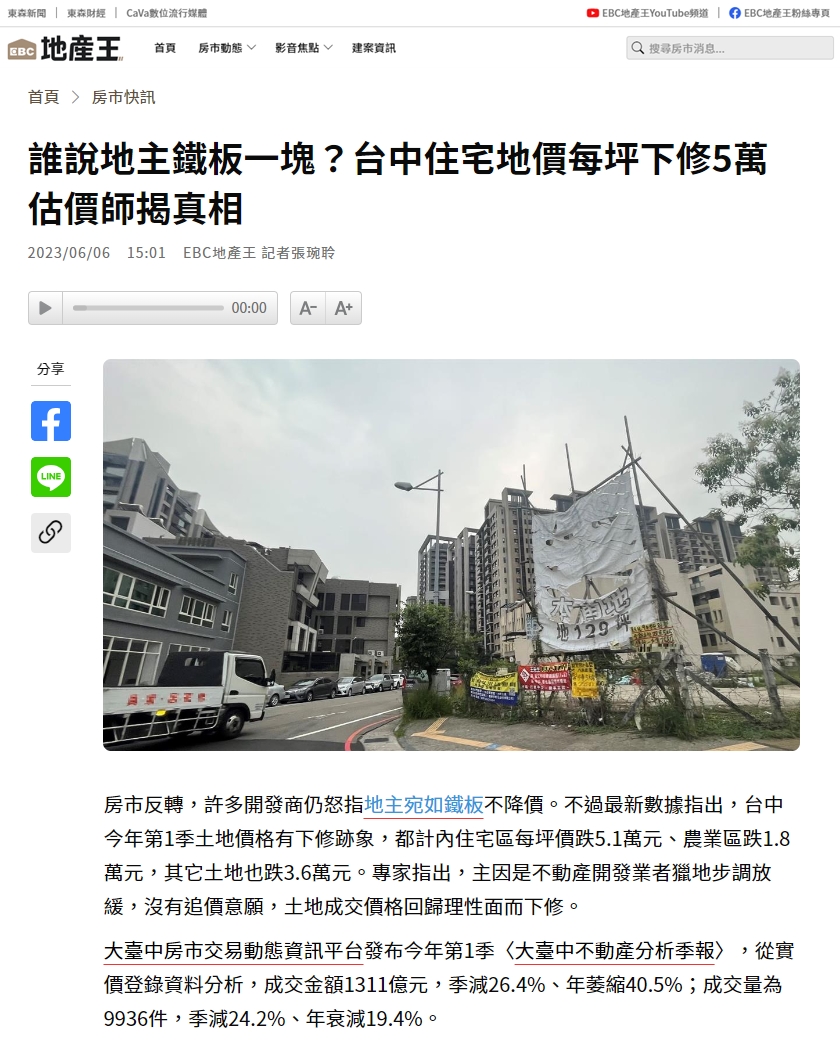 房市反轉,許多開發商仍怒指地主宛如鐵板不降價。不過最新數據指出,台中今年第1季土地價格有下修跡象,都計內住宅區每坪價跌5.1萬元、農業區跌1.8萬元,其它土地也跌3.6萬元。專家指出,主因是不動產開發業者獵地步調放緩,沒有追價意願,土地成交價格回歸理性面而下修。