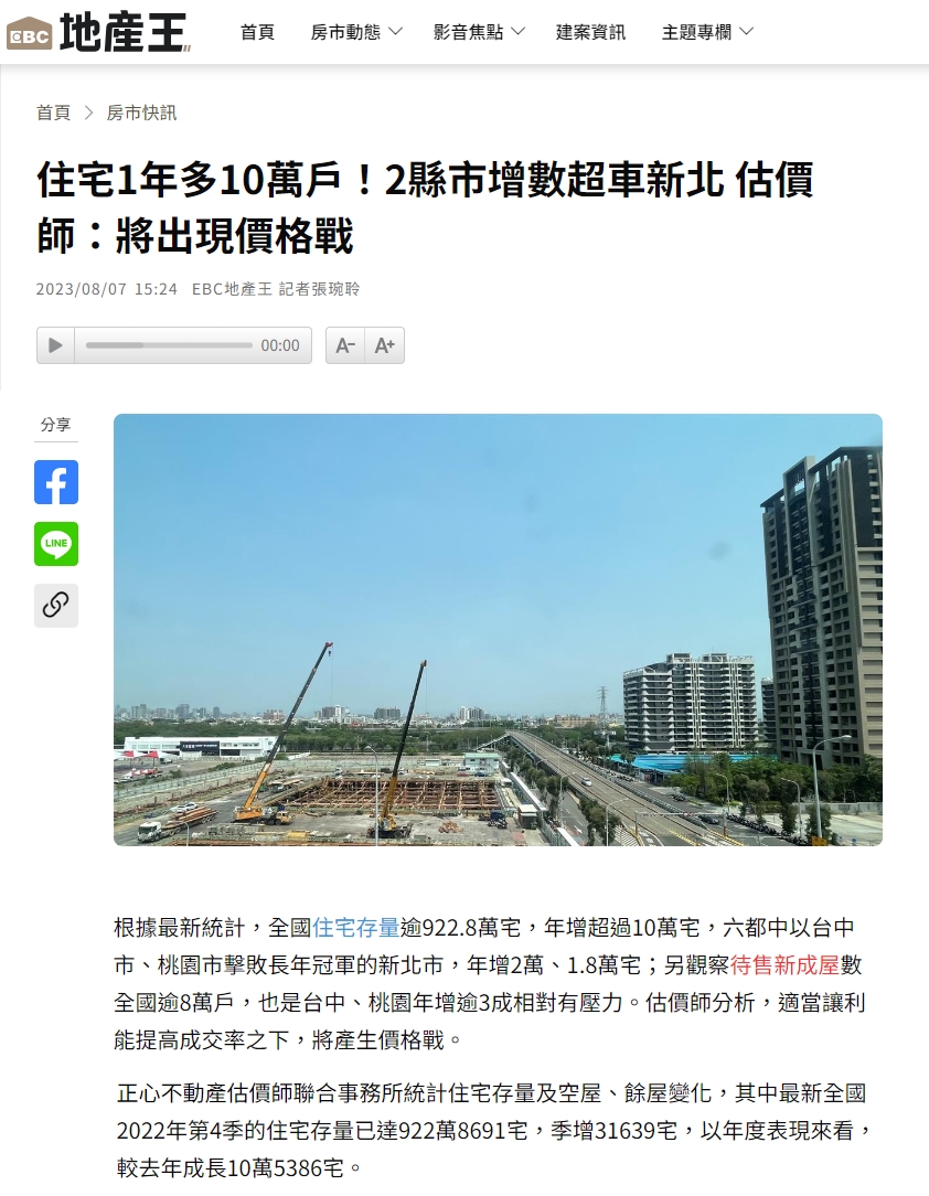 根據最新統計,全國住宅存量逾922.8萬宅,年增超過10萬宅,六都中以台中市、桃園市擊敗長年冠軍的新北市,年增2萬、1.8萬宅;另觀察待售新成屋數全國逾8萬戶,也是台中、桃園年增逾3成相對有壓力。估價師分析,適當讓利能提高成交率之下,將產生價格戰。