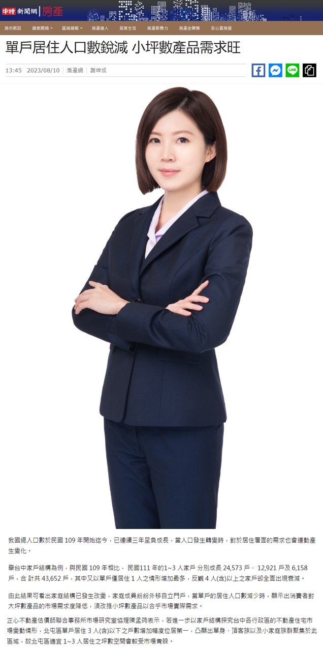 正心不動產估價師聯合事務所市場研究室協理陳孟筠表示,若進一步以家戶結構探究台中各行政區的不動產住宅市場變動情形,北屯區單戶居住3人(含)以下之戶數增加幅度位居第一,凸顯出單身、頂客族以及小家庭族群聚集於此區域,故北屯區適宜1~3人居住之坪數空間會較受市場青睞。