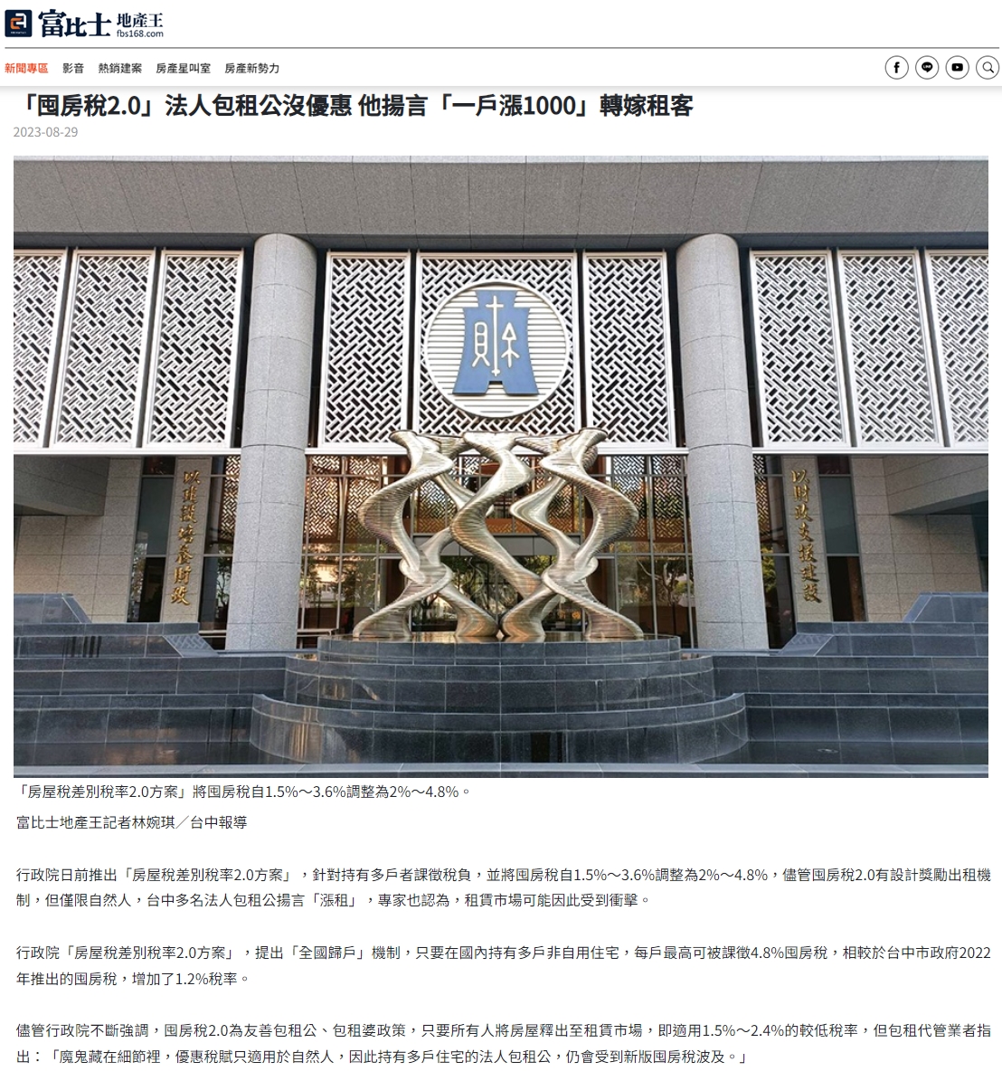 行政院日前推出「房屋稅差別稅率2.0方案」,針對持有多戶者課徵稅負,並將囤房稅自1.5%~3.6%調整為2%~4.8%,儘管囤房稅2.0有設計獎勵出租機制,但僅限自然人,台中多名法人包租公揚言「漲租」,專家也認為,租賃市場可能因此受到衝擊。
