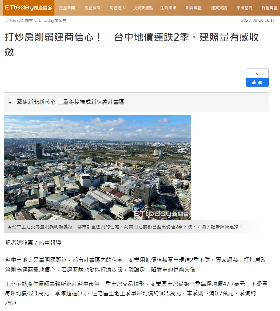 台中土地交易量明顯萎縮,都市計畫區內的住宅、商業用地價格甚至出現連2季下跌。專家認為,打炒房政策削弱建商獵地信心,若建商購地動能持續放緩,恐讓房市陷嚴重的供需失衡。