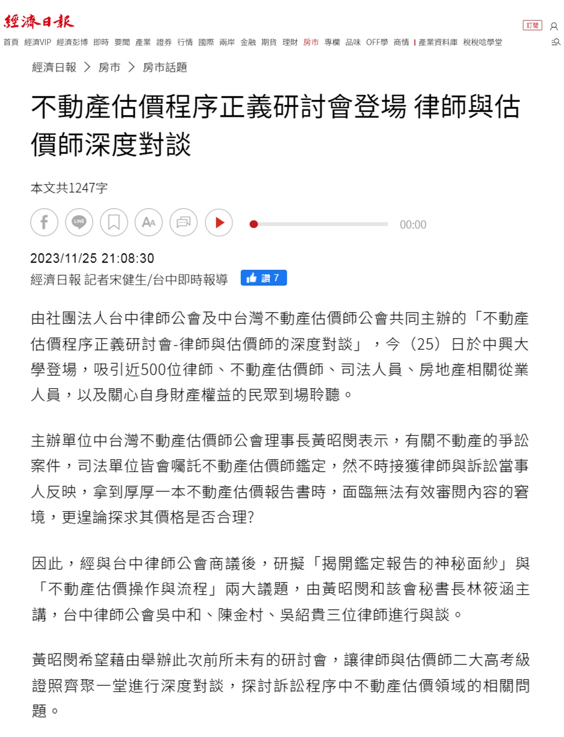 因此,經與台中律師公會商議後,研擬「揭開鑑定報告的神秘面紗」與「不動產估價操作與流程」兩大議題,由黃昭閔和該會秘書長林筱涵主講,台中律師公會吳中和、陳金村、吳紹貴三位律師進行與談。