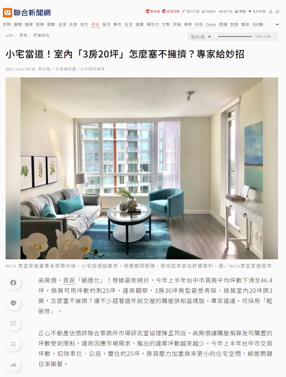 正心不動產估價師聯合事務所市場研究室協理陳孟筠說,高房價讓購屋預算及可購置的坪數受到限制,建商因應市場需求,推出的建案坪數越來越少,今年上半年台中市交易坪數,扣除車位、公設,實住約25坪,房貸壓力加重換來更小的住宅空間,蝸居問題日漸顯著。