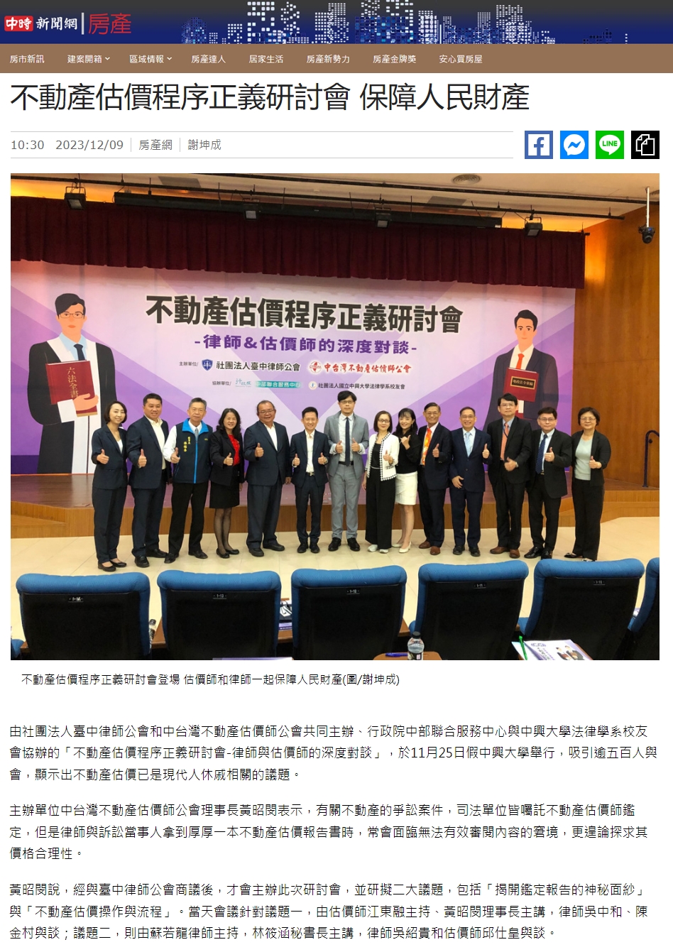 由社團法人臺中律師公會和中台灣不動產估價師公會共同主辦、行政院中部聯合服務中心與中興大學法律學系校友會協辦的「不動產估價程序正義研討會-律師與估價師的深度對談」,於11月25日假中興大學舉行,吸引逾五百人與會,顯示出不動產估價已是現代人休戚相關的議題。
