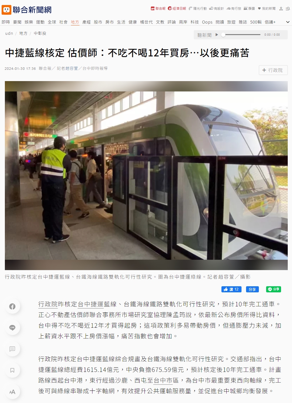 行政院昨核定台中捷運藍線、台鐵海線鐵路雙軌化可行性研究,預計10年完工通車。正心不動產估價師聯合事務所市場研究室協理陳孟筠說,依最新公布房價所得比資料,台中得不吃不喝近12年才買得起房;這項政策利多易帶動房價,但通膨壓力未減,加上薪資水平跟不上房價漲幅,痛苦指數也會增加。