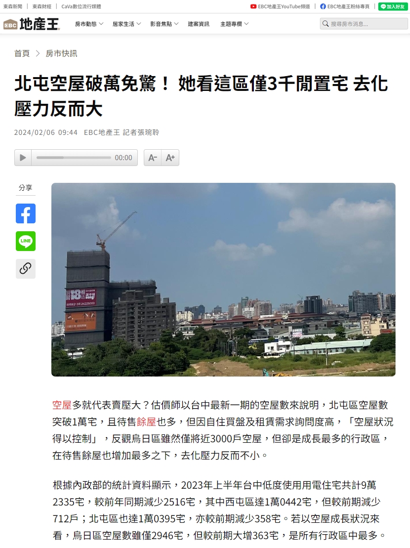 正心不動產估價師聯合事務所市場研究室協理陳孟筠指出,整體數據顯示空屋活化率日趨提升,尤其以北屯區來說,雖然空屋宅數突破1萬宅,且新屋量持續湧進中,但受惠其地理位置及區域發展的優勢,不論是自住買盤抑或是租賃需求,詢問度仍高,使得空屋狀況得以控制。