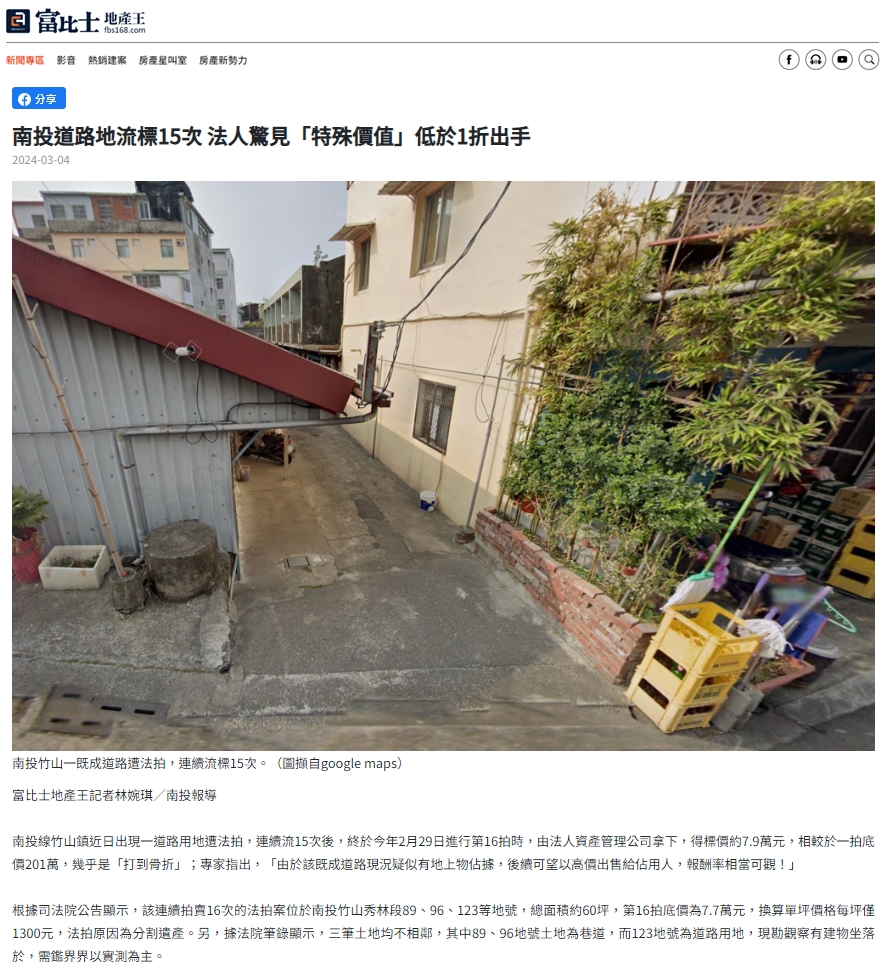 南投線竹山鎮近日出現一道路用地遭法拍,連續流15次後,終於今年2月29日進行第16拍時,由法人資產管理公司拿下,得標價約7.9萬元,相較於一拍底價201萬,幾乎是「打到骨折」;專家指出,「由於該既成道路現況疑似有地上物佔據,後續可望以高價出售給佔用人,報酬率相當可觀!」