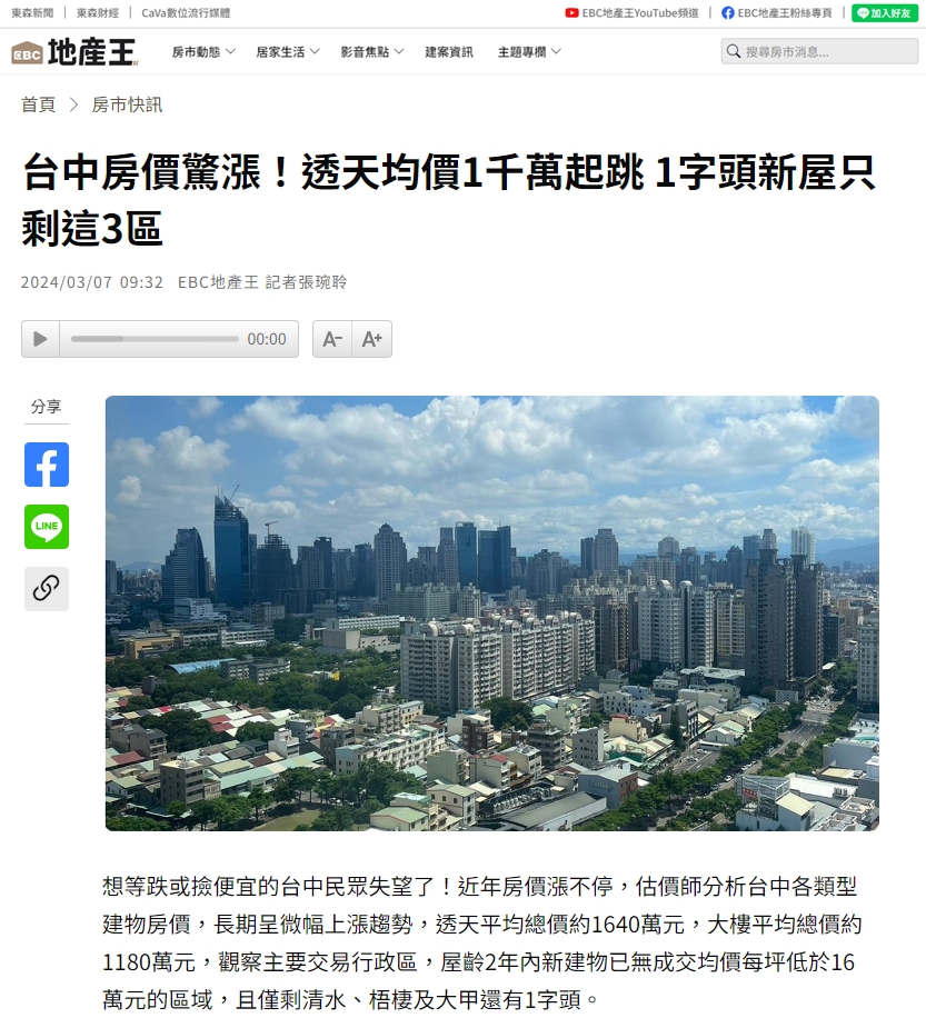 想等跌或撿便宜的台中民眾失望了!近年房價漲不停,估價師分析台中各類型建物房價,長期呈微幅上漲趨勢,透天平均總價約1640萬元,大樓平均總價約1180萬元,觀察主要交易行政區,屋齡2年內新建物已無成交均價每坪低於16萬元的區域,且僅剩清水、梧棲及大甲還有1字頭。