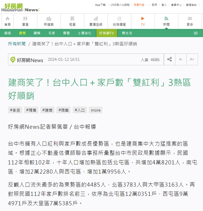台中市擁有人口紅利與家戶數成長優勢區,也是建商集中火力猛推案的區域。根據正心不動產估價師聯合事務所彙整台中市民政局數據顯示,民國112年相較102年,十年人口增加熱區包括北屯區、共增加4萬8201人,南屯區、增加2萬2280人與西屯區、增加1萬9956人。