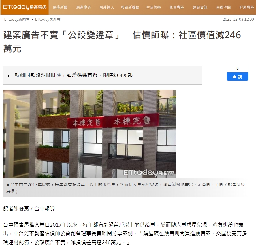 台中預售屋推案量自2017年以來,每年都有超過萬戶以上的供給量,然而隨大量成屋兌現,消費糾紛也盡出,中台灣不動產估價師公會創會理事長黃昭閔分享案例,「購屋族在預售期間買進預售案,交屋後竟有多項建材配備、公設廣告不實,減損價差高達246萬元。」
