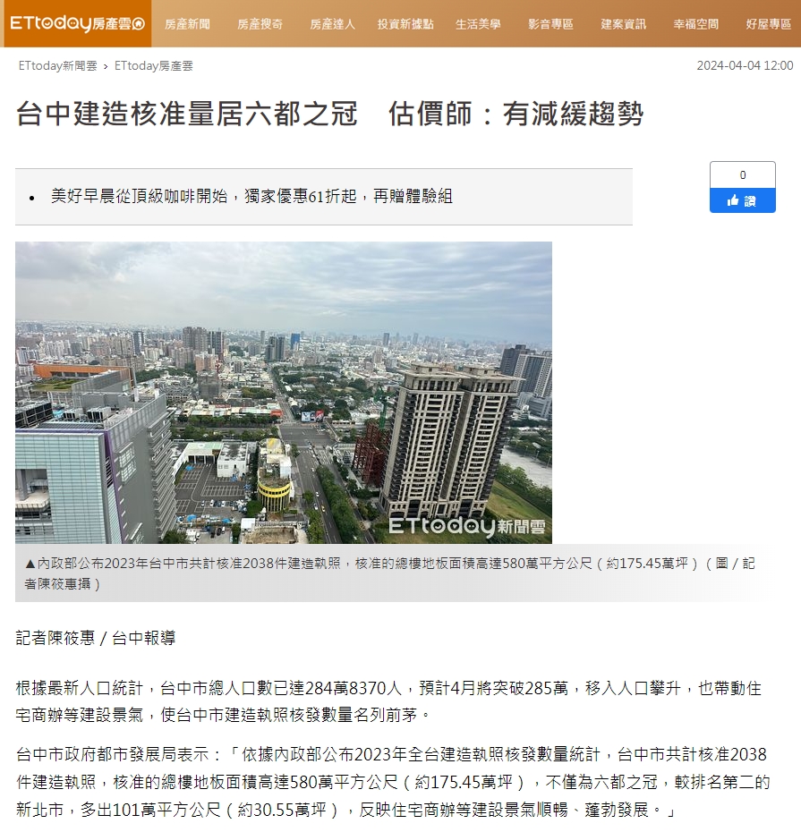 台中市政府都市發展局表示:「依據內政部公布2023年全台建造執照核發數量統計,台中市共計核准2038件建造執照,核准的總樓地板面積高達580萬平方公尺(約175.45萬坪),不僅為六都之冠,較排名第二的新北市,多出101萬平方公尺(約30.55萬坪),反映住宅商辦等建設景氣順暢、蓬勃發展。」