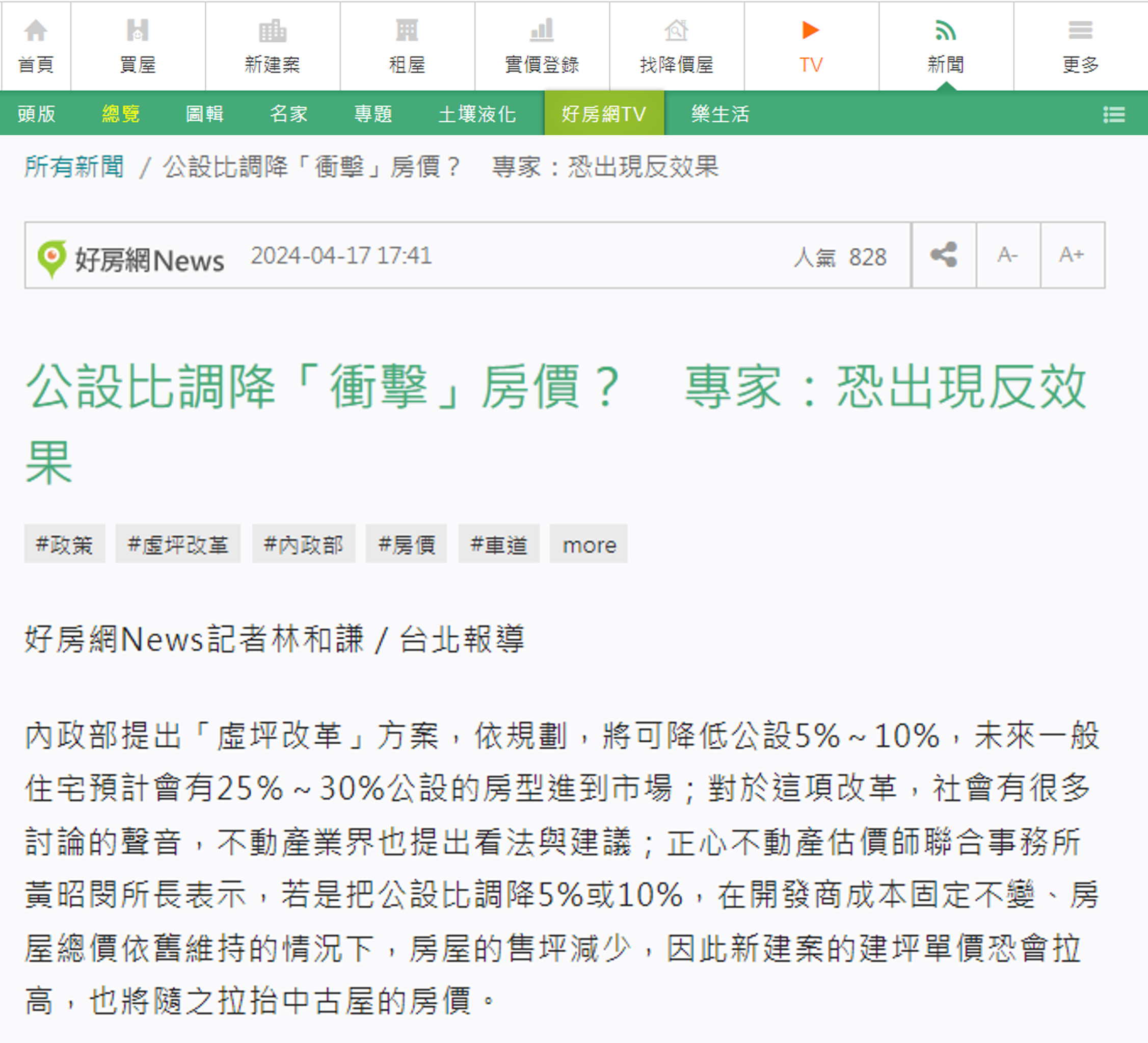 內政部提出「虛坪改革」方案,依規劃,將可降低公設5%~10%,未來一般住宅預計會有25%~30%公設的房型進到市場;對於這項改革,社會有很多討論的聲音,不動產業界也提出看法與建議;正心不動產估價師聯合事務所黃昭閔所長表示,若是把公設比調降5%或10%,在開發商成本固定不變、房屋總價依舊維持的情況下,房屋的售坪減少,因此新建案的建坪單價恐會拉高,也將隨之拉抬中古屋的房價。