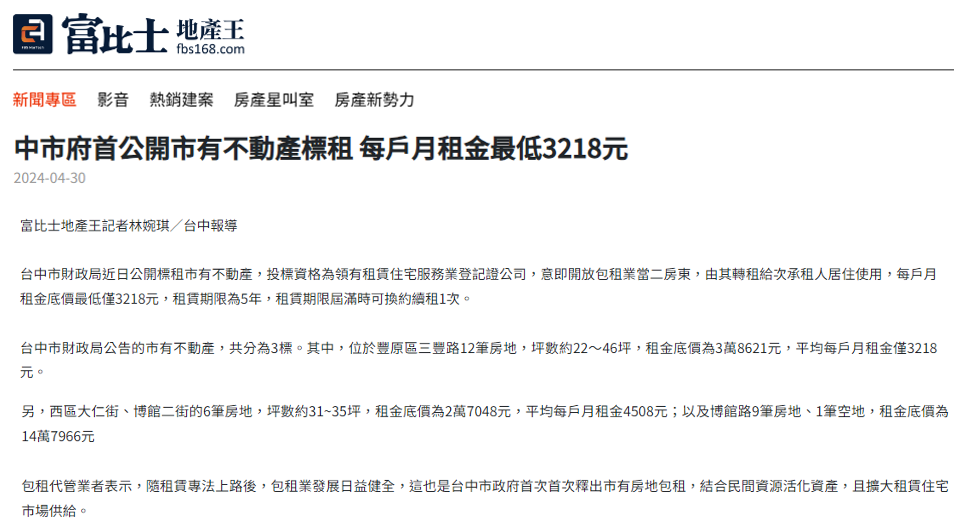 台中市財政局近日公開標租市有不動產,投標資格為領有租賃住宅服務業登記證公司,意即開放包租業當二房東,由其轉租給次承租人居住使用,每戶月租金底價最低僅3218元,租賃期限為5年,租賃期限屆滿時可換約續租1次。