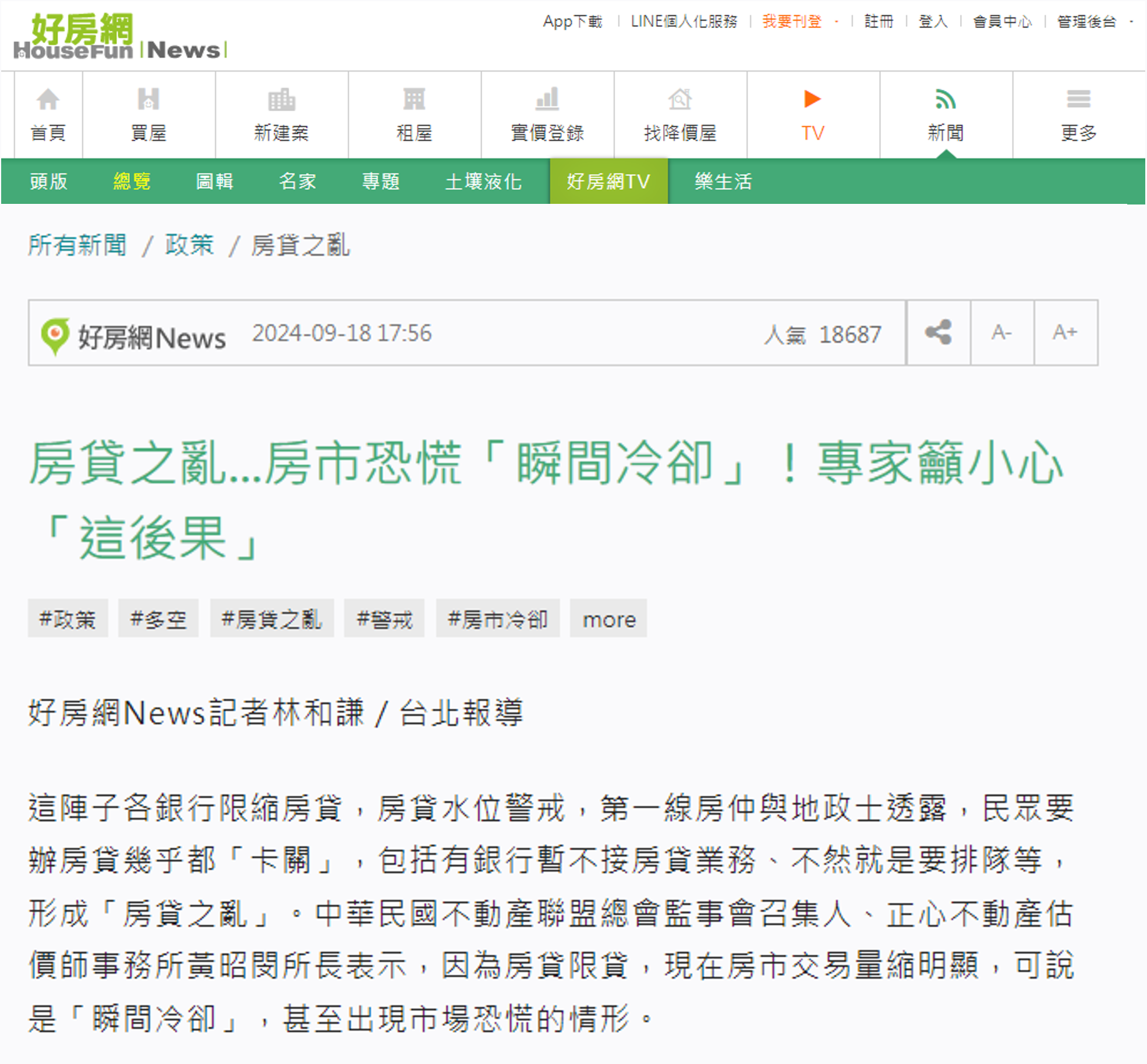 這陣子各銀行限縮房貸,房貸水位警戒,第一線房仲與地政士透露,民眾要辦房貸幾乎都「卡關」,包括有銀行暫不接房貸業務、不然就是要排隊等,形成「房貸之亂」。中華民國不動產聯盟總會監事會召集人、正心不動產估價師事務所黃昭閔所長表示,因為房貸限貸,現在房市交易量縮明顯,可說是「瞬間冷卻」,甚至出現市場恐慌的情形。