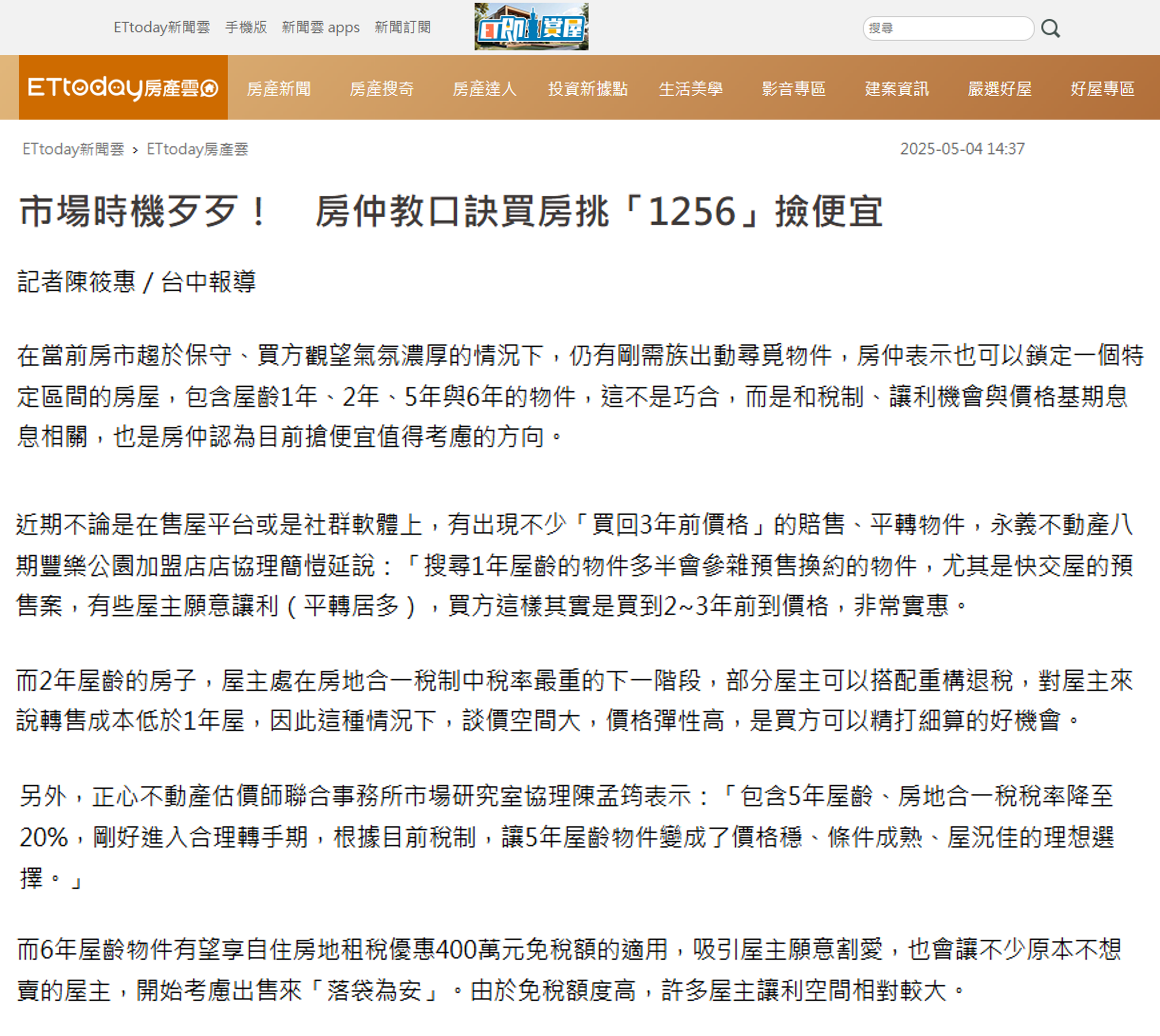 另外,正心不動產估價師聯合事務所市場研究室協理陳孟筠表示:「包含5年屋齡、房地合一稅稅率降至20%,剛好進入合理轉手期,根據目前稅制,讓5年屋齡物件變成了價格穩、條件成熟、屋況佳的理想選擇。」