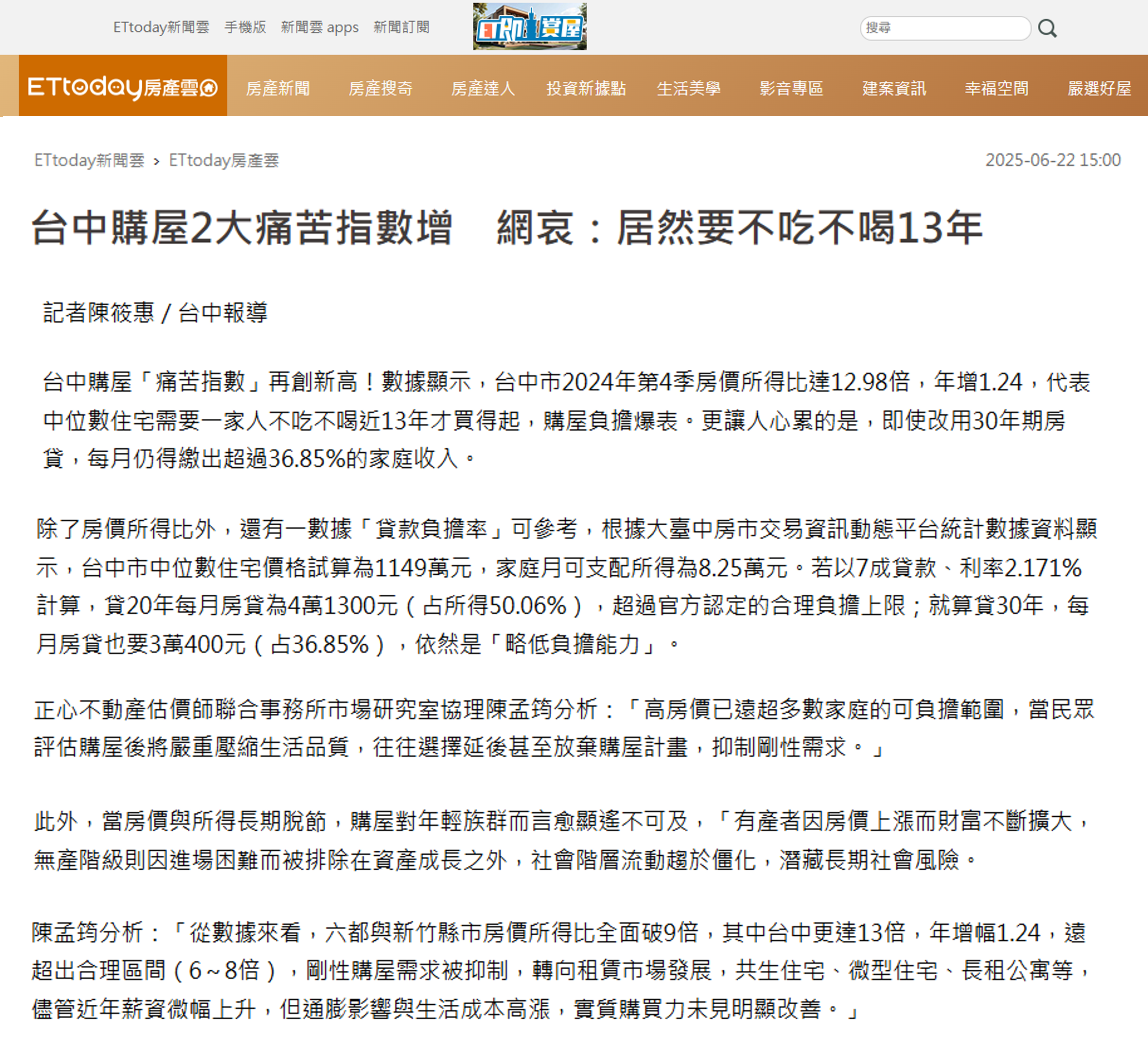 台中購屋「痛苦指數」再創新高!數據顯示,台中市2024年第4季房價所得比達12.98倍,年增1.24,代表中位數住宅需要一家人不吃不喝近13年才買得起,購屋負擔爆表。更讓人心累的是,即使改用30年期房貸,每月仍得繳出超過36.85%的家庭收入。