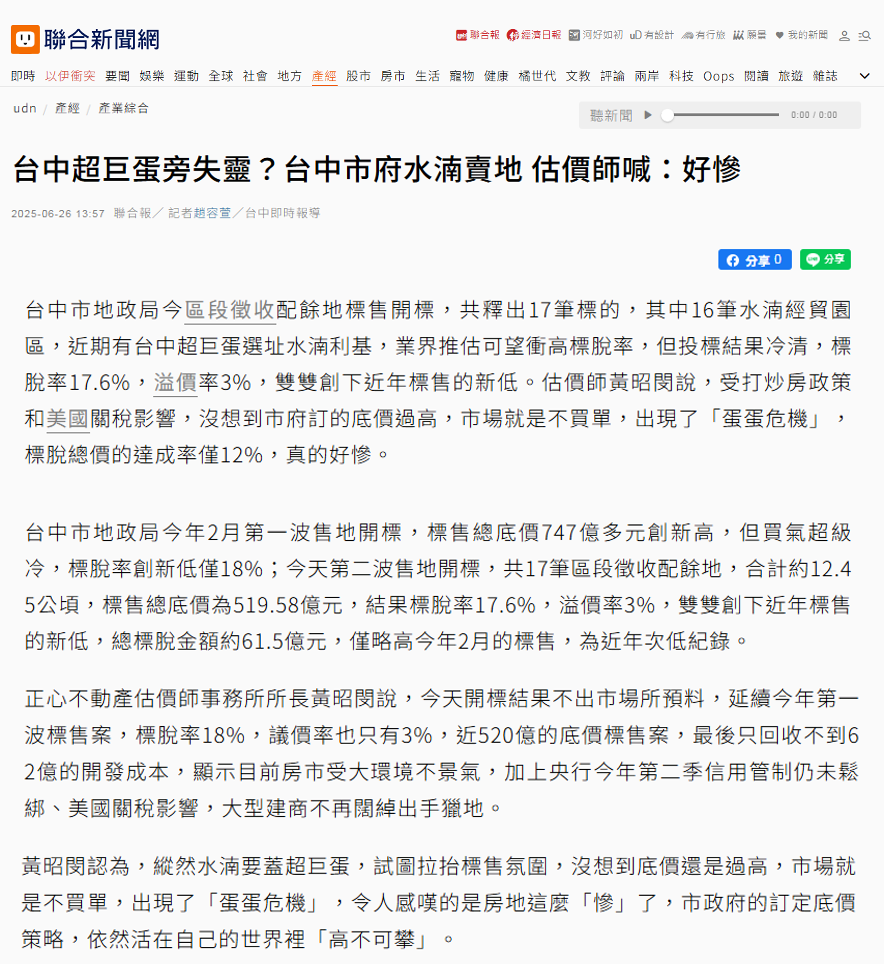 台中市地政局今區段徵收配餘地標售開標,共釋出17筆標的,其中16筆水湳經貿園區,近期有台中超巨蛋選址水湳利基,業界推估可望衝高標脫率,但投標結果冷清,標脫率17.6%,溢價率3%,雙雙創下近年標售的新低。估價師黃昭閔說,受打炒房政策和美國關稅影響,沒想到市府訂的底價過高,市場就是不買單,出現了「蛋蛋危機」,標脫總價的達成率僅12%,真的好慘。