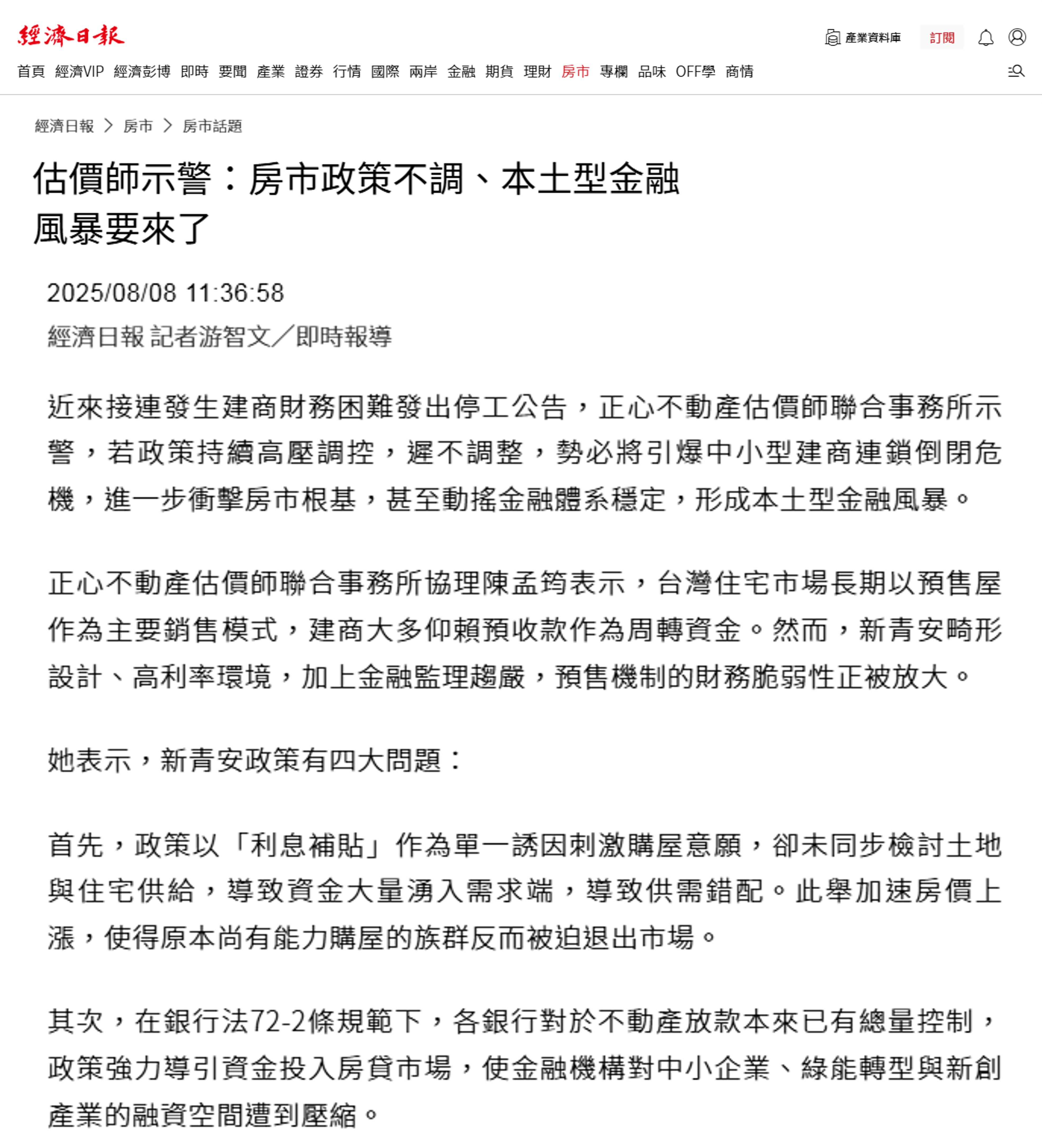 她表示,為防範系統性風險擴散,政府應儘速檢討現行調控措施,鬆綁過度僵化的政策,即時挽回產業信心,才能阻止惡性循環全面蔓延。