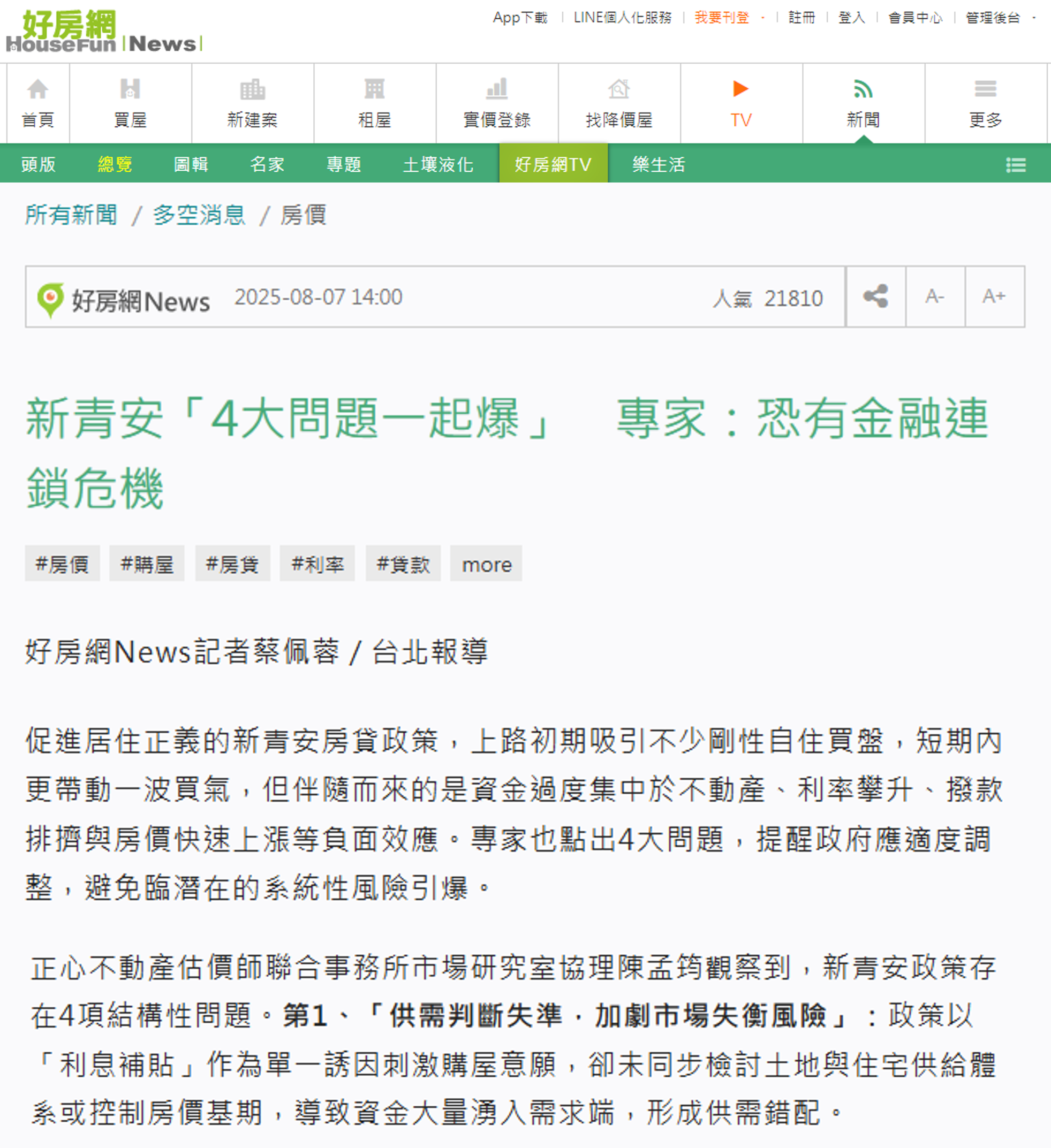 促進居住正義的新青安房貸政策,上路初期吸引不少剛性自住買盤,短期內更帶動一波買氣,但伴隨而來的是資金過度集中於不動產、利率攀升、撥款排擠與房價快速上漲等負面效應。專家也點出4大問題,提醒政府應適度調整,避免臨潛在的系統性風險引爆。