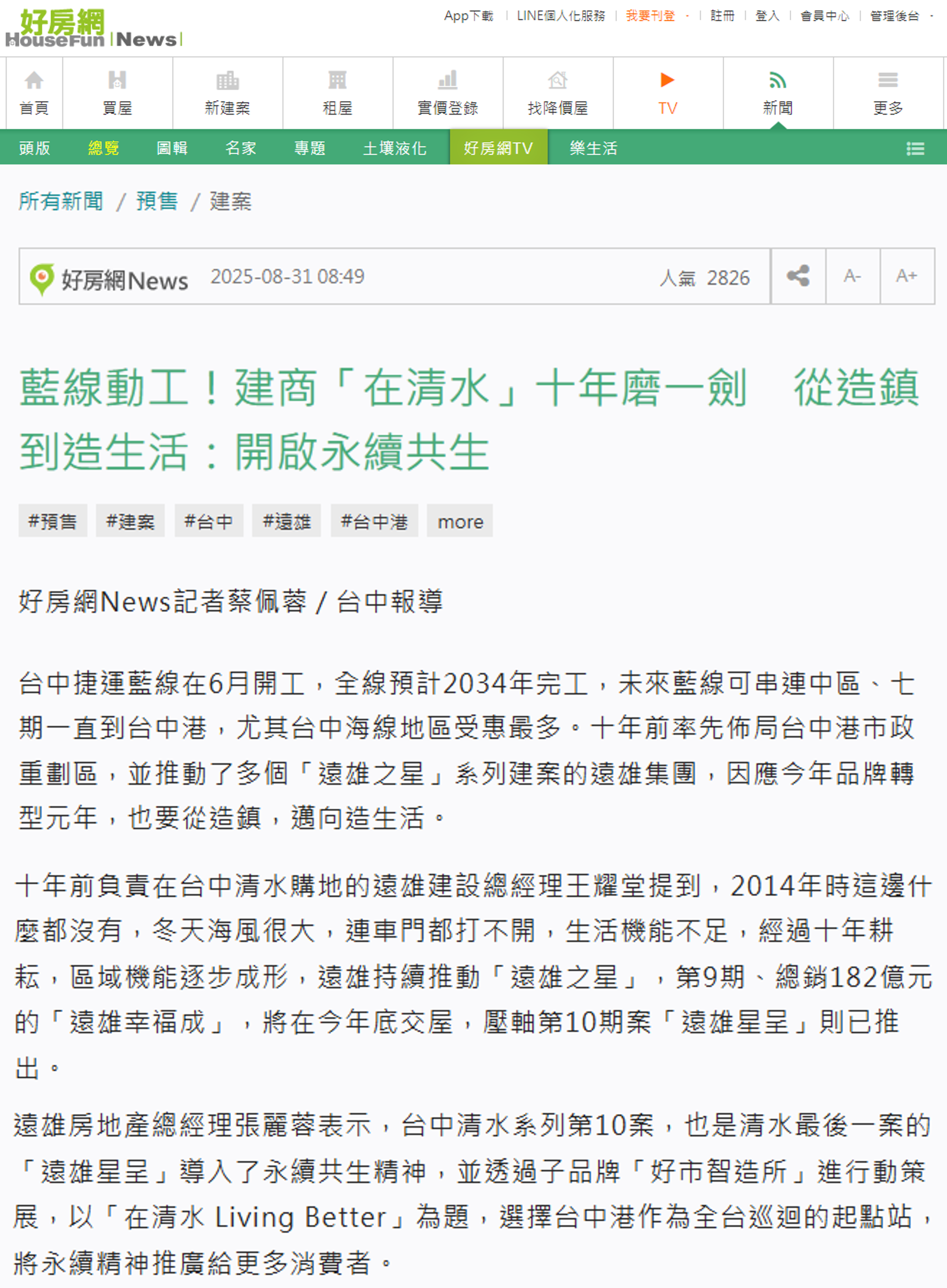 十年前負責在台中清水購地的遠雄建設總經理王耀堂提到,2014年時這邊什麼都沒有,冬天海風很大,連車門都打不開,生活機能不足,經過十年耕耘,區域機能逐步成形,遠雄持續推動「遠雄之星」,第9期、總銷182億元的「遠雄幸福成」,將在今年底交屋,壓軸第10期案「遠雄星呈」則已推出。